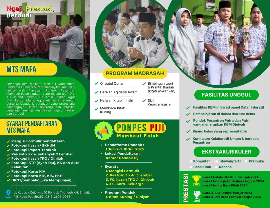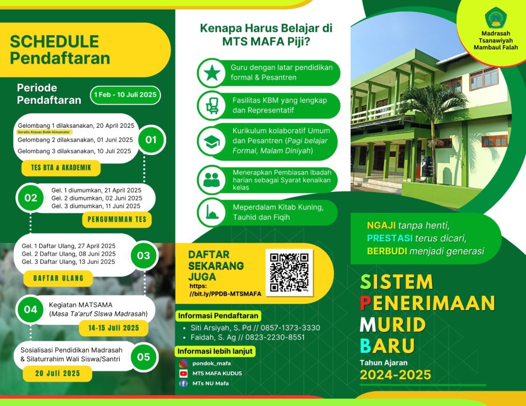 MTs. Mambaul Falah Membuka Pendaftaran Siswa Baru Tahun Ajaran 2025/2026, Pendaftaran bisa Ofline / Online…, untuk daftar online Klik Link di bawah ini….https://bit.ly/PPDB-MTSMAFA